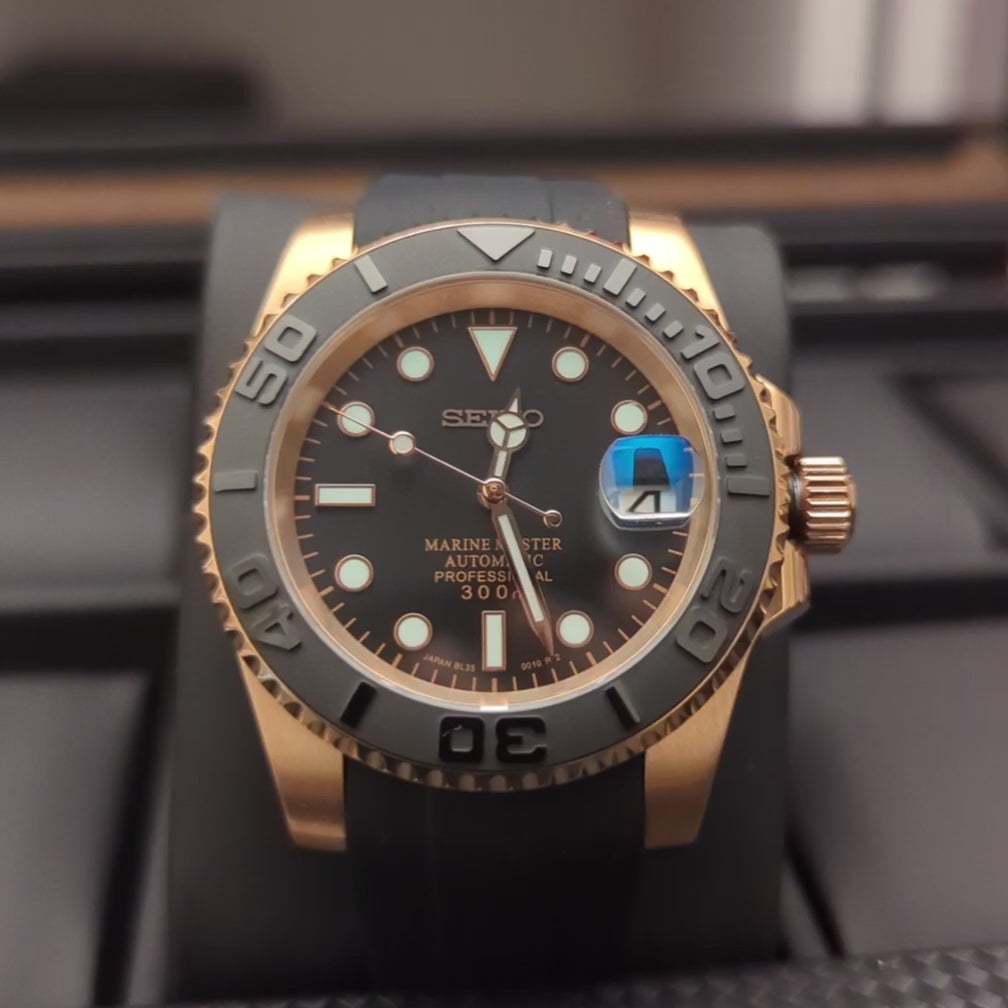 Embrace luxury with our Yachtmaster-style rose gold PVD dive watch, designed for elegance and durability. Featuring a Seiko automatic movement, this timepiece combines premium craftsmanship with reliable performance.