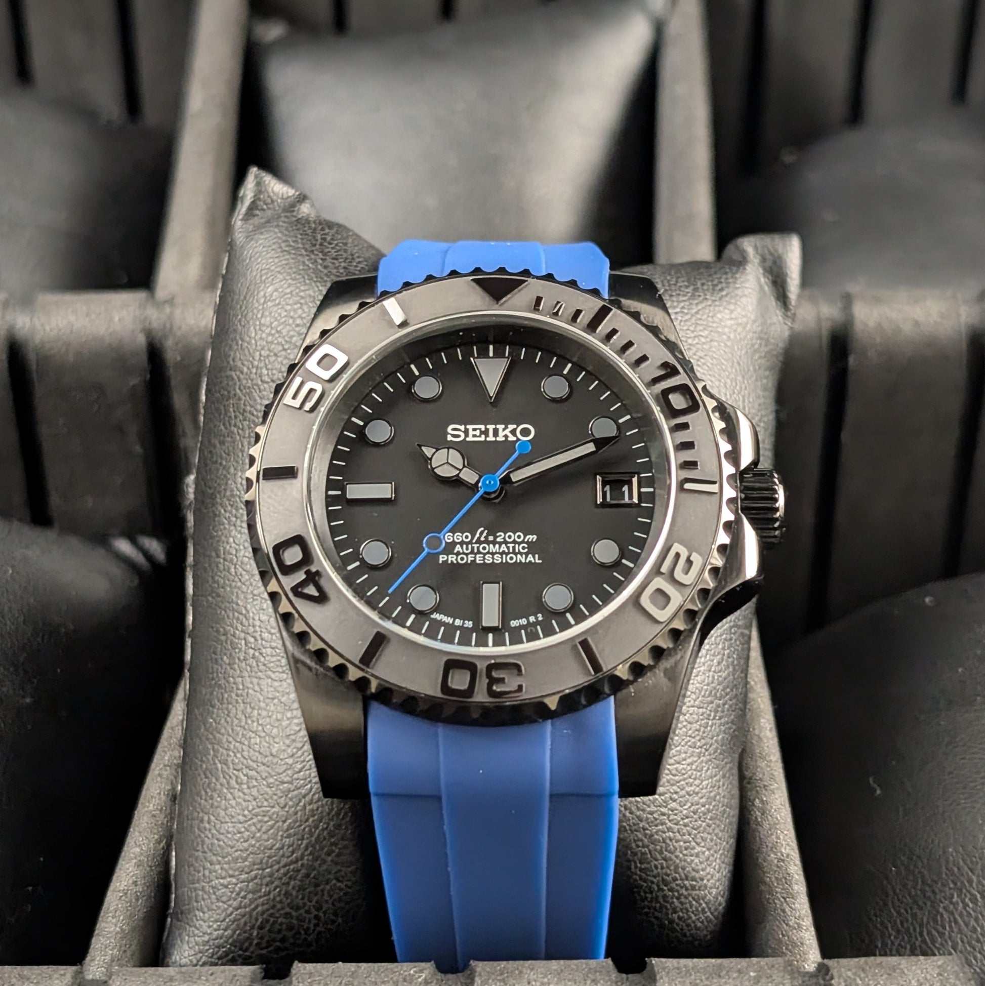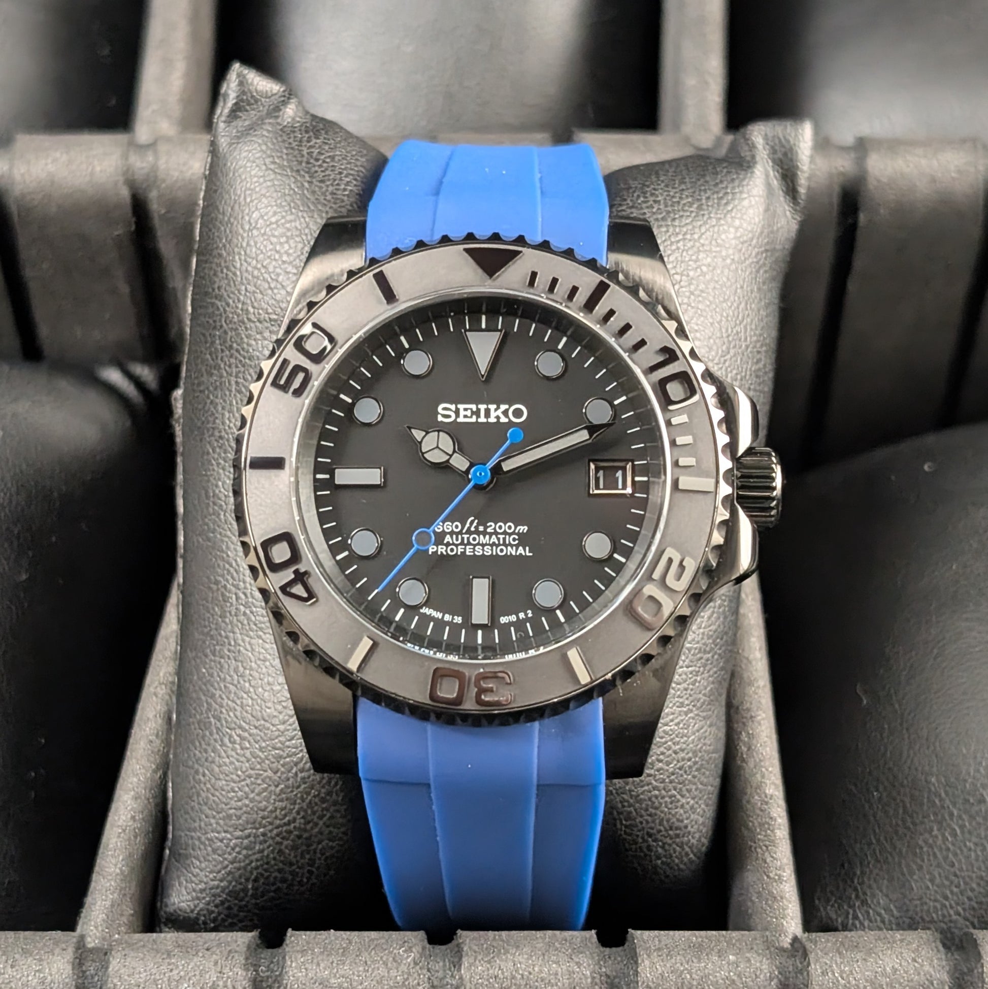 The Dark Knight Blueline is a bold take on our all-black Seiko mod—designed to stand out with its vivid Blue seconds hand and matching blue silicone strap. Featuring a PVD-coated stainless steel case, ceramic bezel, and a sapphire crystal with cyclops, this watch balances tactical edge with sporty energy. Powered by the dependable NH35 automatic movement, it's built for everyday wear with attitude.