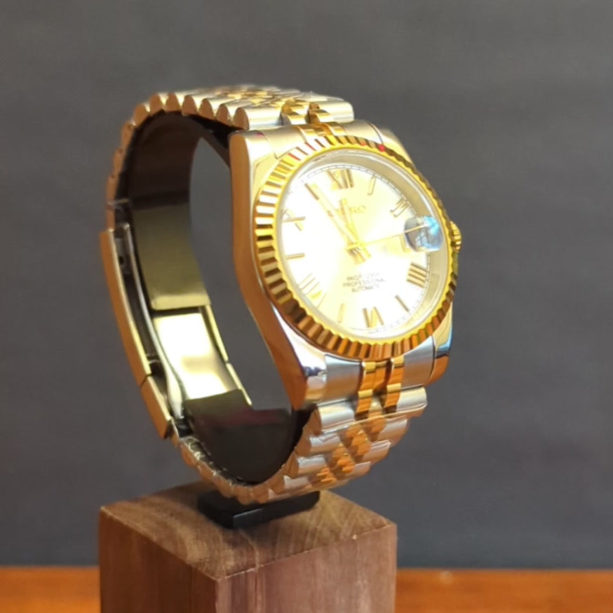 Experience timeless elegance with the DateJust Roman Numeral Two-Tone Gold Seiko Mod NH35, a custom-built watch that blends classic design with modern reliability. Featuring a 36mm or 39mm two-tone stainless steel case, a sapphire crystal, and powered by the Seiko NH35 automatic movement, this timepiece offers both style and performance. The Roman numeral dial and two-tone Jubilee bracelet add a touch of sophistication, making it a versatile accessory for any occasion.