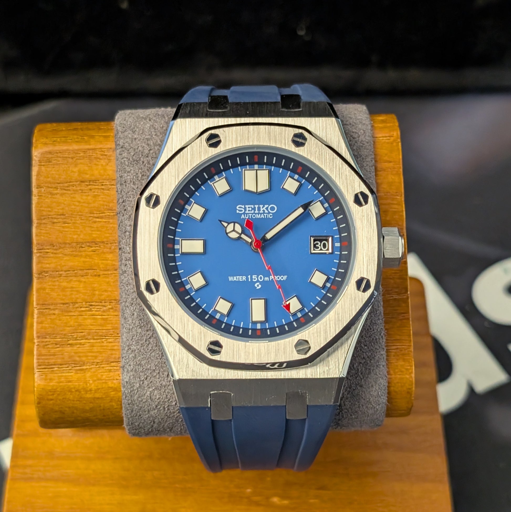 The SeikOak Blue Marine Custom Mod offers a striking take on the classic octagonal case design with a vivid deep blue dial and bold red accents. Built around the dependable Seiko NH35 automatic movement, it features a brushed stainless steel case, angular applied indices, and a date window at 3 o'clock. The red-tipped seconds hand and minute track add a sporty edge, while the matching blue rubber strap completes its nautical-inspired look.