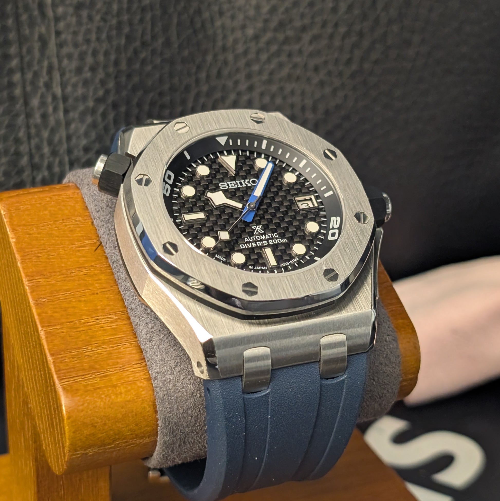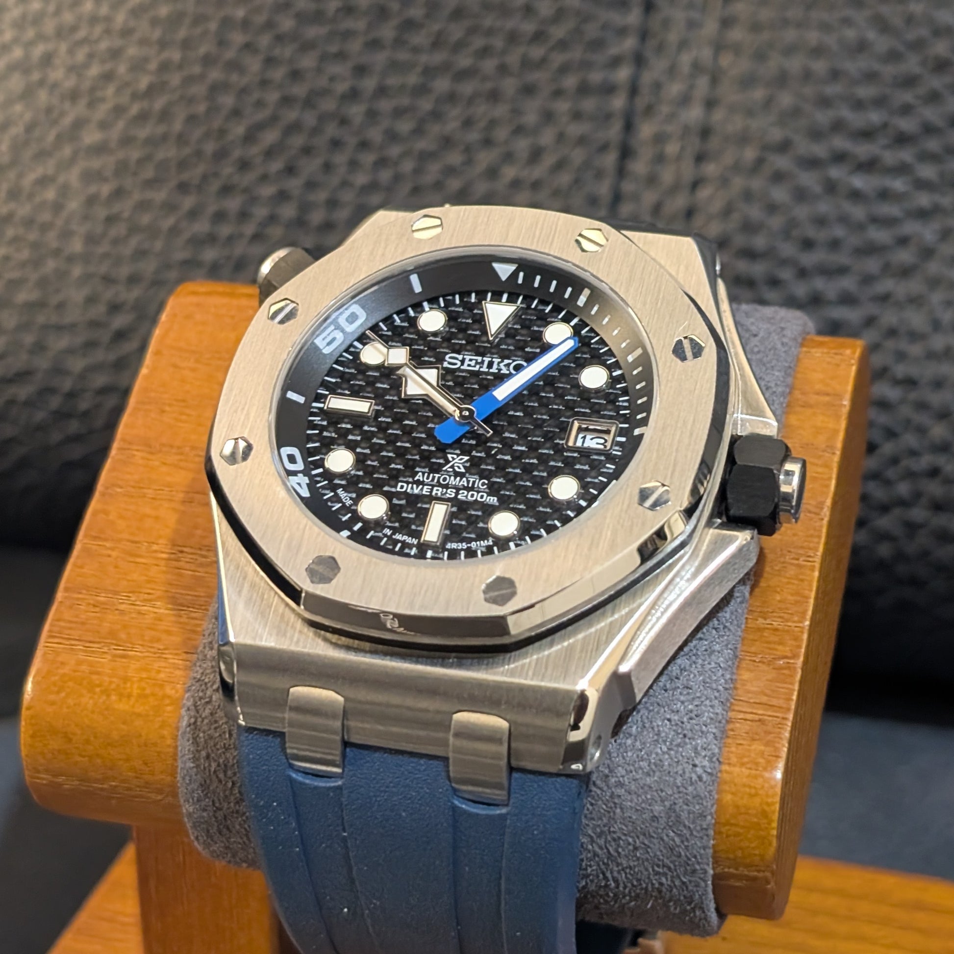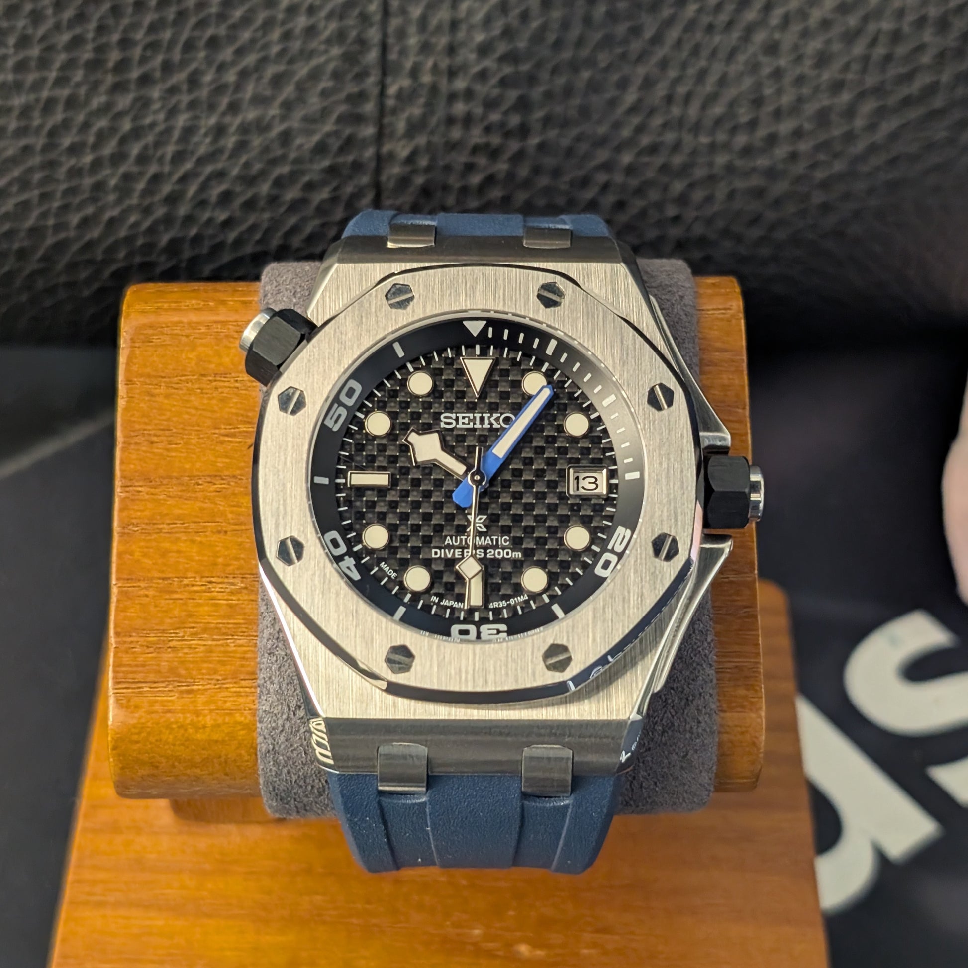 A rugged and vibrant custom timepiece, the SeikOak Offshore Blue Ocean Diver blends bold wrist presence with true tool-watch functionality. The striking carbon fiber-look dial sits beneath a sapphire crystal with a fully functional rotating diver bezel placed internally—protected from wear while staying usable. Paired with a matching Blue silicone strap, this watch is built for attention and adventure.