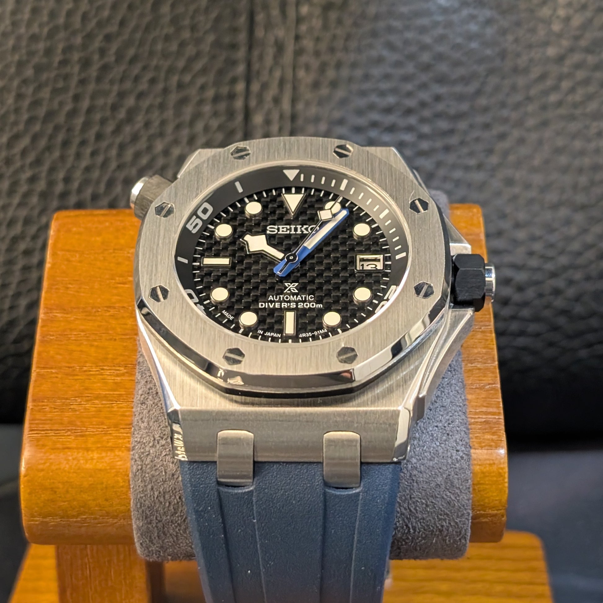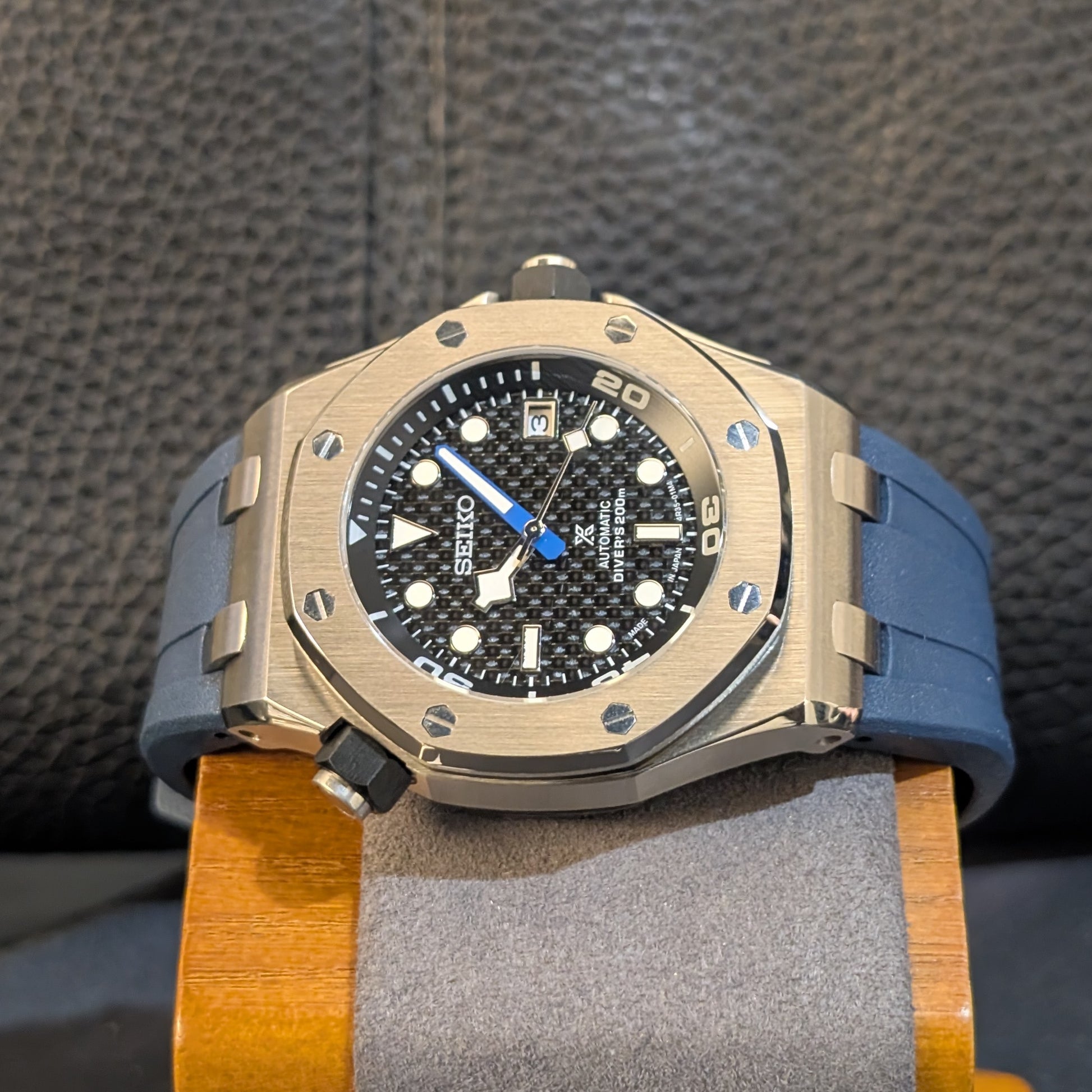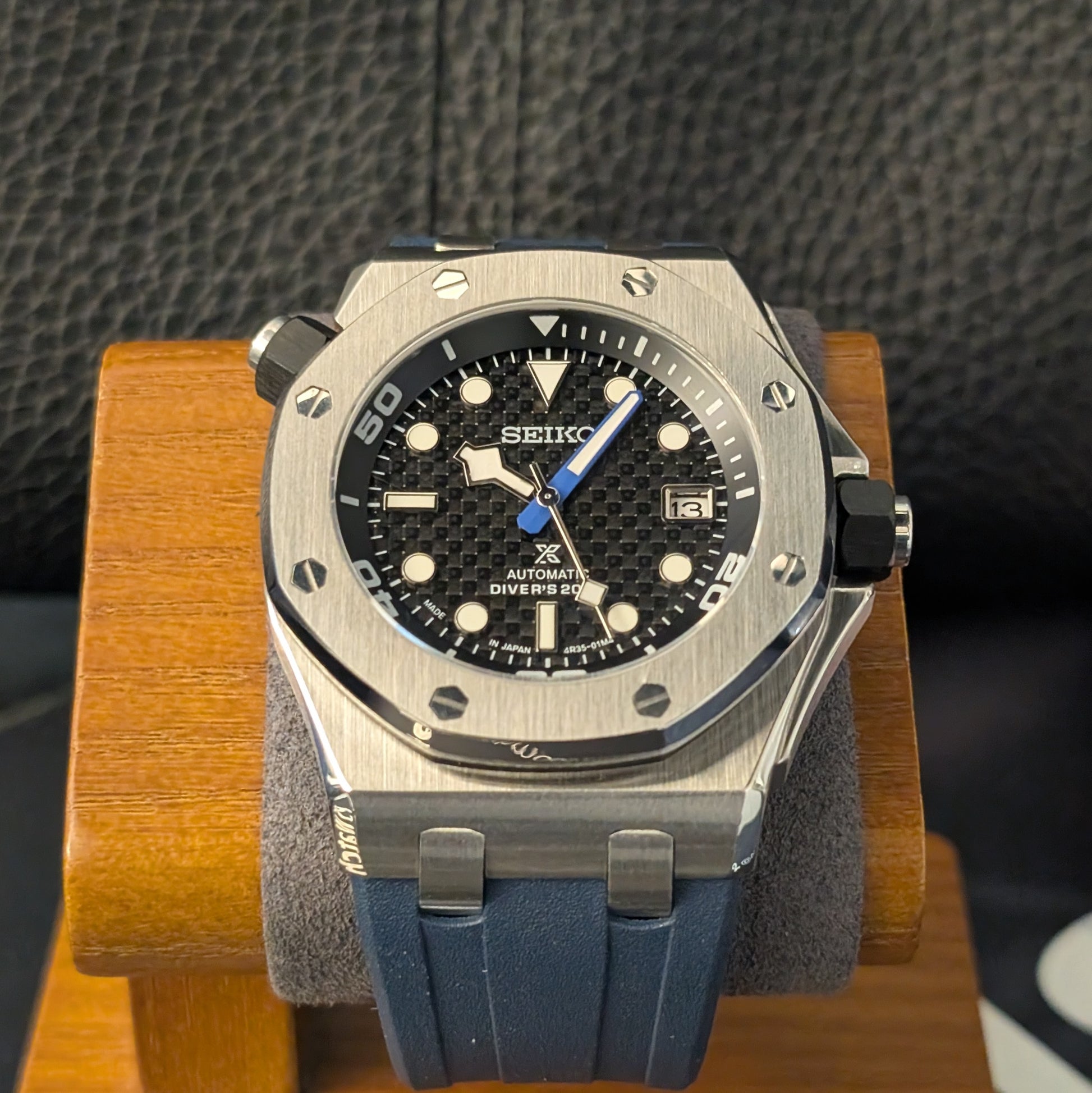 A rugged and vibrant custom timepiece, the SeikOak Offshore Blue Ocean Diver blends bold wrist presence with true tool-watch functionality. The striking carbon fiber-look dial sits beneath a sapphire crystal with a fully functional rotating diver bezel placed internally—protected from wear while staying usable. Paired with a matching Blue silicone strap, this watch is built for attention and adventure.