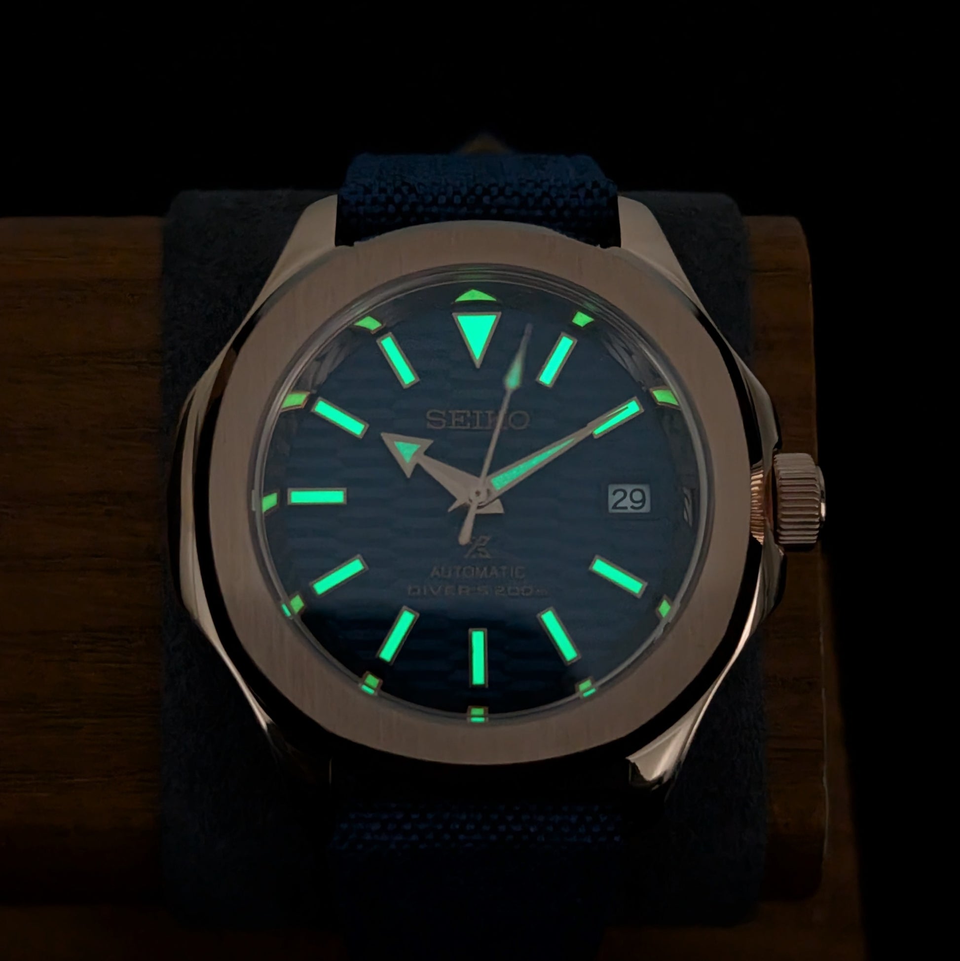 The SeikoNaut Blue Wave blends rugged sportiness with a refined aesthetic. Featuring a textured blue dial reminiscent of ocean waves and a Rose Gold PVD stainless steel case, this watch stands out as both versatile and stylish. Paired with a durable blue sailcloth/canvas strap, it’s designed for those who appreciate unique craftsmanship and comfort.